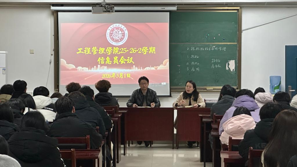为进一步夯实新学期教学管理基础,充分发挥班级信息员在教学运行中的桥梁纽带作用,2026年3月1日下午,工程管理学院在4201培训教室召开新学期教学信息员工作会议。会议由教学秘书张帆主持,教学副院长陈文峰出席并讲话,各班级信息员及班长共70余人参加
