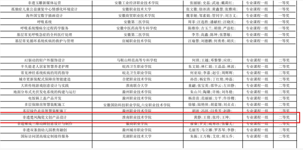 近日,2025年安徽省高等职业院校教学能力大赛专业决赛落幕,工程管理学院选派的教师团队,凭借《非遗楚风文创陶瓷产品设计》荣获二等奖,实现学院在该比赛文化艺术大类领域的重要突破。